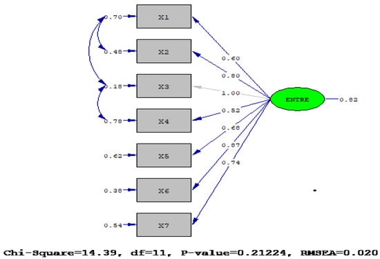 The third variable analysed is the measurement model of student entrepreneurship competency. In line with the theory, there are seven dimensions of entrepreneurial spirit being tested, namely the innovative dimension (X1), challenge taking (X2), hard work (X3), result-oriented character (X4), independence (X5), skill in business (X6), and future-oriented character (X7). Broadly speaking, the results of the analysis of the measurement of student entrepreneurship competency models are presented in Figure 3 as follows.
