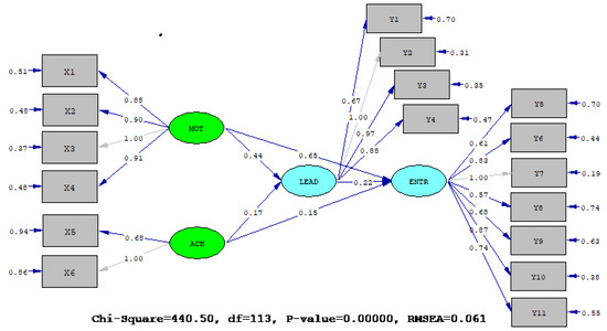 Structural effects of achievement motivation, achievement, leadership, and student entrepreneurial spirit. MOT = Achievement Motivation. ACH = Achievement. LEAD = Leadership. ENTR = Entrepreunership.