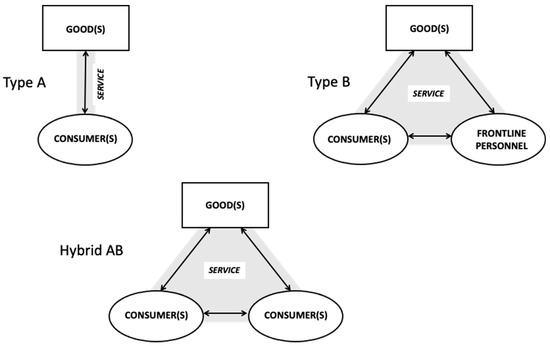 Focusing on goods, i.e., artifacts used in service provision and produced by manufacturing firms, there are two general types of contexts of use in which consumers are engaged (Figure 1). In the first, let’s call them type A contexts, goods are used directly by consumers in their homes or in other places and situations (e.g., driving a car). The second ones, call them contexts of type B, are characterized by the co-presence of two kinds of actors: consumers and frontline personnel to the dependencies of an organization of services. Essentially, type B contexts find correspondence in the concept of service encounter employed in service marketing research (Bitner and Wang 2014; Robinson et al. 2020). In these contexts, the role of the user of the goods may be played by frontline personnel alone, even if the consumer enters into contact with, for example, the razor and other goods used by the barber. There are, however, type B contexts in which the consumer is also a user, for example when, in a gym, an instructor teaches a client to use a machine. The consumption contexts of types A and B are networks of actors and goods. Their complexity grows as the number of goods that are used in the context increases, as does the number of co-present consumers1 and—in type B—co-present service employees (and also the number of service organizations to which they belong).