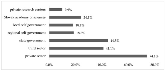 Among the 776 respondents of the survey, 56.06% of these researchers declare the existence of a cooperation link with an actor in the application sphere. While more than half of the respondents cooperated with the practice, we still consider this information to be worrisome. Employees of Slovak universities are most often defined as pedagogical and research employees at the same time while the scope of their work also includes developing cooperation with actors in the external environment. However, as the results of the survey showed, at most, almost half of the university’s creative staff was in contact with the application sphere thanks to the collection of data for their scientific research activities.