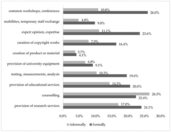 Another question of key importance was whether informal linkages influence the dynamics of academic engagement and knowledge transfer based on interpersonal cooperation to a negligible extent. The opposite probably turns out to be a reality. Table 2 shows the proportions of cooperating academics in a sample (those that had at least one case of cooperation with an external actor in 2018) that used listed knowledge transfer channels to shift knowledge/information towards an external partner formally and informally. Academics in our sample provide support to non-academic actors most often through counselling. In 2018, more than a third of cooperating respondents provided counselling to non-academic actors, while 22.4% reported formal counselling (under contract) and 26.5% of respondents declared that they also provided informal counselling. Although this is the only transfer channel where we have seen a higher proportion of academics collaborating more informally than formally, looking at the results for other channels in Figure 2, it is evident that under the conditions of Slovakia, the support for the practice, and therefore, the dissemination of knowledge is also largely facilitated informally. Informal support is provided to non-academic actors in Slovakia also in the case of the production of products or materials (4.1% cooperated formally, 3.7% informally), provision of unique technical equipment of the university (9.1% formal, 6.8% informally) or creation of copyright works (16.4% formal, 7.9% informal). Given the unfinished policies, systems of control of academic activities or support tools at many Slovak universities, a significant share of cooperation with practice is, thus, facilitated informally.