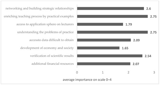 Figure 3 represents the average scores for the expected benefits from academic engagement identified by the respondents in our sample. In view of the fact that the majority of creative jobs at universities in Slovakia have a mixed scientific-pedagogical character, the most important expectations of cooperation with practice are in the form of non-financial benefits. The highest average significance was recorded in the case of enrichment of the teaching process with practical examples and understanding of the real problems of the application sphere (average importance score 2.75). This is also logically linked to the need to strategically build long-term relationships with key stakeholders (average importance 2.6). Researchers not only need to get inputs into their teaching or scientific activities but often want to test hypothesises in the “real world”. Thus, verification of their own scientific results outside the academic sphere reached a still relatively high average score of 2.54.