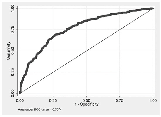 We use the graph of the ROC curve and AUC to check the classification performance of our model, respective of how much is our model capable to distinguish between 0 and 1 classes (Figure 4). When AUC is approximately 0, the model is actually reciprocating the classes. It means that the model is predicting a negative class as a positive class and vice versa. When AUC is approximately 0.5, the model has no discrimination capacity to distinguish between positive class and negative class. The area under the curve of 0.77, in the case of our model, indicates acceptable discrimination for the model.