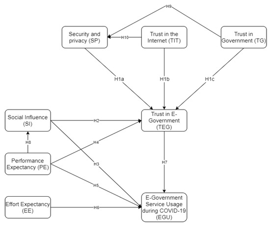 Considering the abovementioned theoretical models and resorting to the relevant literature, the current study proposes a comprehensive research model that represents the multifactorial and complex perception of citizens towards e-government services. The model includes factors such as trust, social influence, perceptions towards the system (performance expectancy and effort expectancy), e-government usage (adapted to COVID-19 conditions) and, finally, the behavioral intention to use e-government services in the future as the dependent variable. It is a comprehensive attempt to approach the subject, studying and bearing in mind that many of the constructs have similar properties in wording the items they measure and the different fields of implementation of related surveys, such as information systems, public administration and e-business. Human behavior and the final adoption and use of a technology or a service is a multifaceted problem, which in the framework of this study is approached by identifying the factors that play a vital role, how they are connected, and the sequence of relationships affecting the result. We have adapted our constructs in the context of e-government services, expecting that the validity of the models will not be affected by the initial context of their use (either being e-commerce, general-purpose information systems or coming from the e-government domain). Figure 1 depicts the proposed research model.