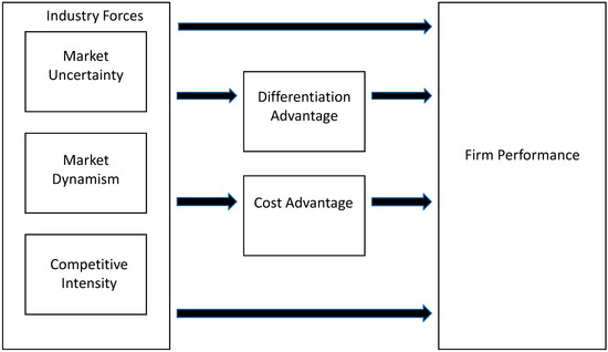 We investigated the impacts of industry forces, namely, market uncertainty, market dynamism, and competitive intensity, on firm performance. Furthermore, we evaluated the effects of competitive advantage as a mediator in these relationships.
