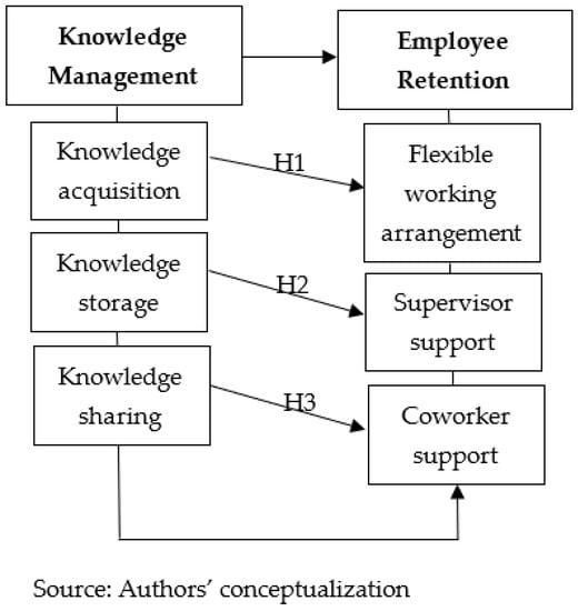 Figure 1 below shows the conceptual framework of the study indicating how research assumptions were developed. In the framework, the predictor variable is knowledge management with its dimensions: knowledge acquisition, knowledge storage, and knowledge sharing. On the right-hand side is the criterion variable (employee retention) with its indicators: flexible working arrangement, supervisor support, and coworker support.
