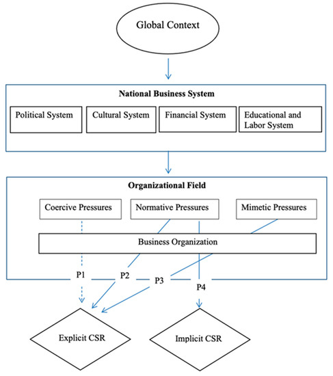 The conceptual model tested in this study incorporates a multi-level institutional view by considering institutional pressures from the global context, institutional pressures from the local context, and institutional pressures from the organizational field to gain insight into the reasons business organizations engage in explicit and implicit CSR activities.