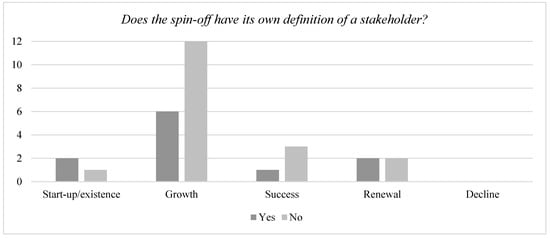 Stakeholders for respondent no. 4 are: “All the people who are important for the success of the organization” (Respondent no. 4, on 16 February). This definition is in line with the description of a stakeholder by respondent no. 14. He states that: “Stakeholders are the main reason for existence” (Respondent 14, on 1 March). Respondent no. 7 defines the stakeholders from the USO as: “Those people who can potentially be influenced by your decisions” (Respondent no. 7, on 18 February). Currently, respondent no. 6 does not find stakeholder management useful for his USO. The respondent cited that: “Stakeholders’ management, and thus defining stakeholders, is not yet a priority in the first five years after the spin-off is established” (Respondent no. 6, on 17 February). For this respondent, the application of stakeholder management is only interesting when the spin-off has acquired a certain size and structure. The spin-off must be further along in its life cycle to explicitly engage in stakeholder management. In the first few years after the spin-off was created, it is mainly the product–market fit that is very important. When the product–market fit is successful, the management has time for additional things, such as stakeholder management (Respondent no. 6, on 17 February). This is not consistent with the research from Matuleviciene and Stravinskiene (2015). They conclude that applying stakeholder management is important in every life cycle stage of the business (Matuleviciene and Stravinskiene 2015). This is because stakeholders have power and can put pressure on the spin-off. An organization must take the potential influence of the stakeholders on the spin-off into account through stakeholder management (Post et al. 2002a, 2002b). Furthermore, a comparison is made between the USO respondents from the different OLC stages (see Figure 5). In the start-up phase, more USOs have made a definition for the term stakeholders than not. In the growth phase and the success phase, it is just the opposite. This is a result we would not expect in the first place. It would seem logical that the more developed a USO is, and thus moved further along its life cycle, the more it thinks about having an explicit definition for its stakeholders. This is not the case. We should note that the number of respondents is not evenly distributed across the different OLC phases. We have no respondents in the decline OLC phase.