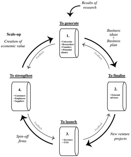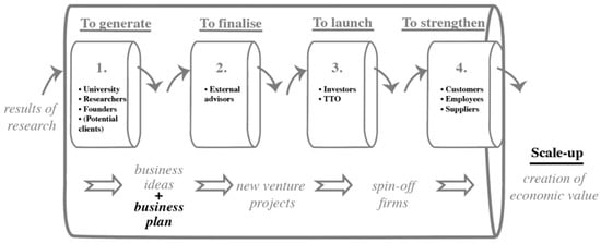In the first stage, the researchers brainstorm about potential commercialization possibilities. There is a need for the right methods and criteria in order to select the most promising ideas of products and/or services. Furthermore, the founders of the potential spin-off need to consider all the possible risks and threats given the fact that the idea comes from basic scientific knowledge or technological research (Ndonzuau et al. 2002). The second stage will transform the brainstorm ideas into realistic entrepreneurial concepts or project. It is the phase where the organization and its activities are designed, and the feasibility of the business model is tested from a financial, technical, and commercial perspective. In the third stage, the best concepts are realized by launching a new spin-off. This stage involves finding the right and sufficient financial resources from private or public investors. In the fourth stage, the spin-off focusses on strengthening the economic value. There is also an improvement of the entrepreneurial culture of the new company.