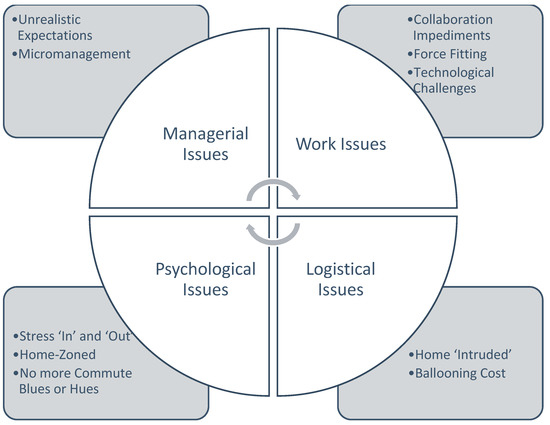 The findings show a kind of work-life integration for the workers as a result of the pandemic-imposed remote work arrangements. The thin line that existed between work and life has seemingly disappeared, with work becoming a synonym for life and life becoming a synonym for work, causing a kind of work-life integration. This paper presents the following structure: we identified four different types of issues faced by Indian millennials (due to pandemic-imposed remote work arrangements in our research) that have also emerged as four major themes, and that have further resulted in 10 sub-themes. The four major themes identified in this research are Managerial Issues, Work Issues, Logistical Issues and Psychological Issues.