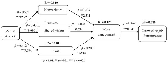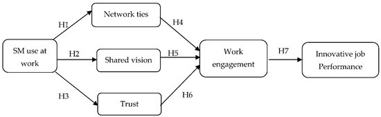 SM allows employees to create and maintain social relationships, besides giving support or advice to colleagues (Charoensukmongkol 2014). Cao et al. (2016) stated that social media can help employers connect with employees who share similar backgrounds and interests, which is helpful for strengthening ties with colleagues, maintaining a professional network, and discovering potential relationships. Adopting social media at work will positively enhance work engagement due to the ability of SM to make it easier for employees to obtain resources from colleagues who are in their network ties. In structural social capital, individuals’ interactions with social networks provide them with various resources, such as advice, information and social support (Jutengren et al. 2020). Moreover, Oksa et al. (2020) discovered that employees who received social support from their network ties via SM interaction positively increased work engagement among the Finnish working population. Thus, employees are more engaged with their work when network ties among colleagues are forged through SM. The fourth hypothesis is: