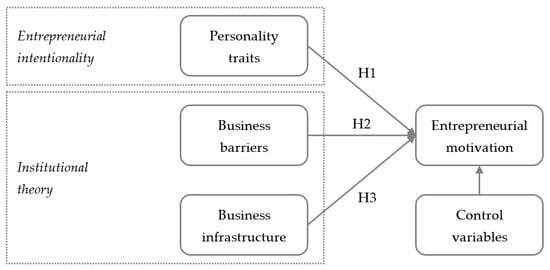 Figure 1 shows the conceptual framework of the current research. As discussed in the literature review, entrepreneurial motivation can be influenced by three domains: personality traits, business barriers, and business infrastructure. They imply at least two theories, such as entrepreneurial intentionality () and institutional theory ().