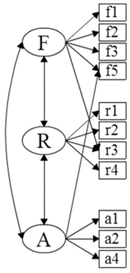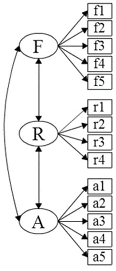 The initial model (Model 1) for this first stage is shown in Figure 1, accurately reflecting the structure of the questionnaire, organized as indicated when describing it, in three factors (Functional, Reputational, and Affective), and adding the possibility of there being correlations between them.