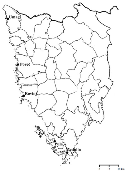 Map of the County of Istria with the towns and the municipality included in the research. Source: authors’ research.