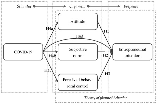 Driven by the theory of planned behavior (Ajzen 1991) and the stimulus–organism–response perspective (Mehrabian and Russell 1974), this study provides a unique and improved research model for investigating the positive impact of COVID-19 on individuals’ intentions to start a business in the context of three post-communist transition countries. Furthermore, the combination of these two theories provides the possibility of investigating the abovementioned relationship by seeing the COVID-19 pandemic as an external inducement (i.e., stimulus) that influences attitudes, subjective norms, perceived behavioral control, and entrepreneurial intention.