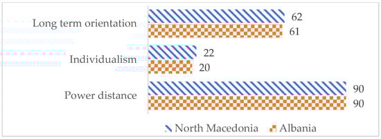Hofstede’s cultural dimensions for Albania and North Macedonia. Source: Hofstede Insights: https://www.hofstede-insights.com/ (accessed on 22 October 2022).