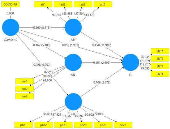 Path analysis—inner model: path coefficients (t-values). Note: ATT, attitude; EI, entrepreneurial intention; PBC, perceived behavioral control; SN, subjective norms; COVID-19, the COVID-19 pandemic.