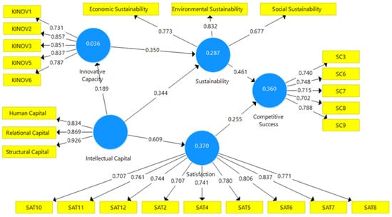 It should be noted that the model considers two higher-order constructs (HOCs), intellectual capital and sustainability. The two-stage approach described by Hair et al. (2018) was used to validate the model. Firstly, loads of the indicators of each lower-order construct (LOCs) relative to sustainability were calculated, which presented three lower-order constructs (economic, social and environmental), and then to intellectual capital, which is also composed of three lower-order constructs (human capital, relational capital, and structural capital). In the first stage, the indicators of the lower-order constructs were repeated in the higher-order constructs. Then, the LOC scores were saved to be used in the second stage. The final model after the second stage described by Hair et al. (2018) can be seen in Figure 2.