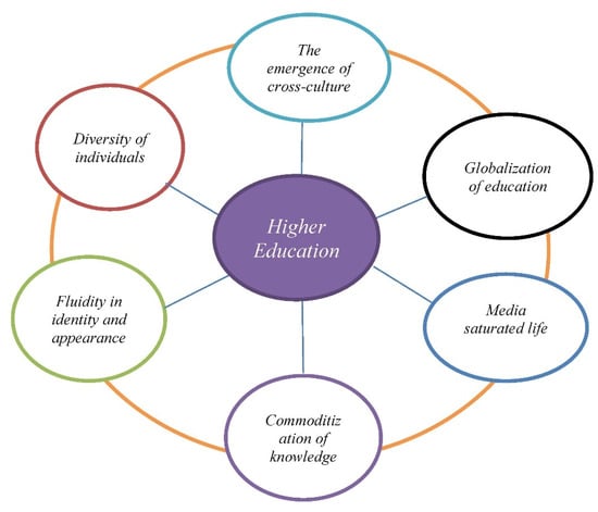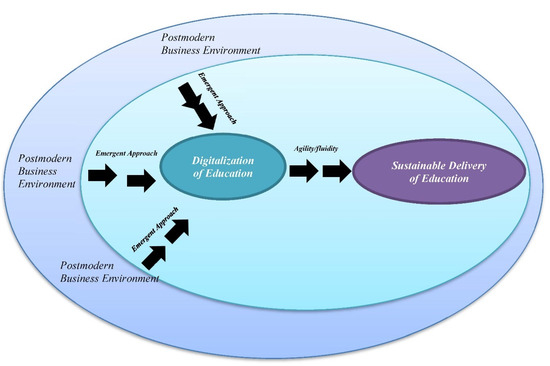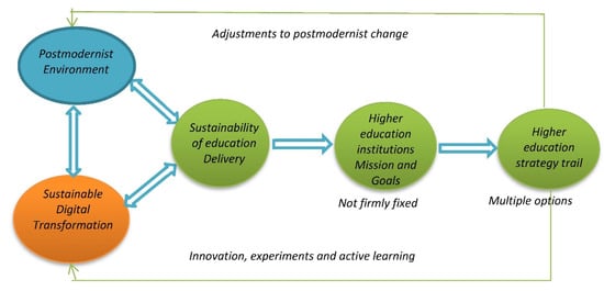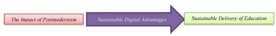 Lyotard 1984). This phenomenon has considerably influenced the sustainable delivery of global education and its landscape and is closely associated with the unique phenomenon of sustainable digital transformation. Digital transformation in the global higher education industry determines the future roadmap to a sustainable education management strategy. Thus, there is a need for higher education to develop emergent education strategies integrated with the forces of postmodernism (