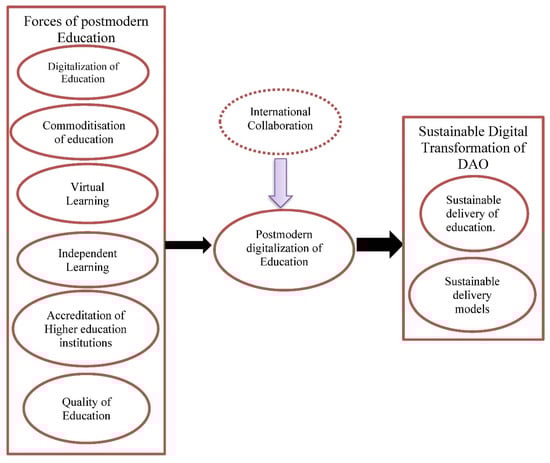 Figure 7) shows the projected association and relationship of postmodern forces of education. We view those as the antecedents of postmodernism of education. Then, it is linked to the influence of postmodernism on education, and as an outcome, how the sustainable delivery of education is impacted is examined by the conceptual model. Further, how the international collaboration of higher education institutions further amplifies the sustainable delivery of education is an important feature of the digital delivery of education. In the postmodern view, this could be viewed as a contextual parameter. Thus, the mediating mechanism is incorporated as one of the key elements of the conceptual framework.