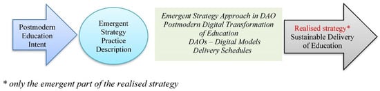 Figure 5), in turn, enables higher education institutions to gain sustainability in the delivery of education. It needs to be highlighted that in the age of globalization, the critical success factors of university education are increasingly standardised. Thus, the notion of building competitive advantage requires thinking beyond conventional structures and resourcing approaches within the education industry, it requires unique models, processes, design thinking and selective integration capabilities. The subsequent sections critically examine the formation/approach to emergent strategy for education, the importance of integrating the global influence of postmodernism and the utility of digital transformation on university education and how it enables building sustainable delivery models for education. Specifically, the phenomenon- Emergent Strategy in Higher Education: Postmodern Digital and the Future? Require thorough examination/investigation to use knowledge in the educational society and strategic management of education as to how to build, retain and protect the process of building competitive advantages (