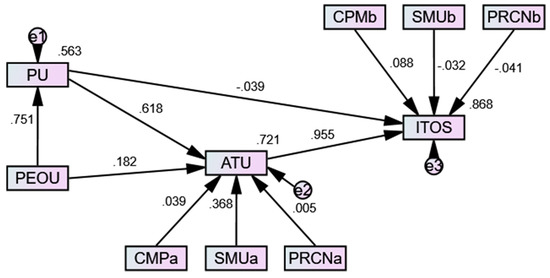 Finally, the reliability of the measurement model is computed as the composite reliability coefficients (CR), whose value should be greater than 0.700 to elicit strong reliability. Table 1 reports the CRs for all constructs, where it is evident that they all abide by the criterion of reliability with the exemption of ATU, whose CR of 0.688 indicates an acceptable reliability.