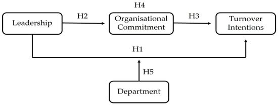 Effective leadership makes employees feel more committed to the organisation where they work (Fiaz et al. 2017). A higher organisational commitment causes their turnover intentions to decrease (Moreira et al. 2022). This reasoning leads us to the indirect effect of organisational commitment on the relationship between leadership style and turnover intentions. Due to this conceptualisation, we aim to analyse the relationship between leadership (transformational and transactional) and turnover intentions through organisational commitment. This reasoning leads us to the formulation of the following hypothesis: