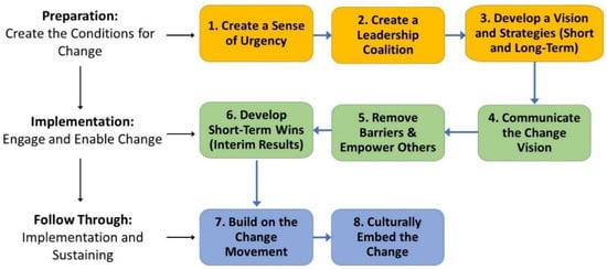 The three phases of organizational change: Preparation, Implementation, and Follow Through (left). Eight phased integrated steps for organizational change (right), revised and recreated from (). Figure used with permission from ().