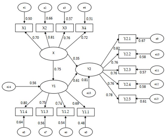 Figure 2 shows the SEM results from AMOS. The model includes 252 recursive samples. It shows the relationship between the three variables and between the indicators and the variables. GTL, the independent variable, positively affects the two dependent variables (GHRM practices and EGB). There are four indicators of GTL (X1, X2, X3, and X4), four of GHRM practices (Y1.1, Y1.2, Y1.3, and Y1.4), and five of EGB (Y2.1, Y2.2, Y2.3, and Y2.4).