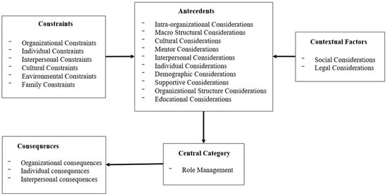 - Antecedents, including cultural considerations, mentor’s considerations, individual considerations, organizational structural considerations, macro structural considerations, intra-organizational considerations, supportive considerations, demographic considerations, interpersonal considerations, and educational considerations, affect role management (as the central category).