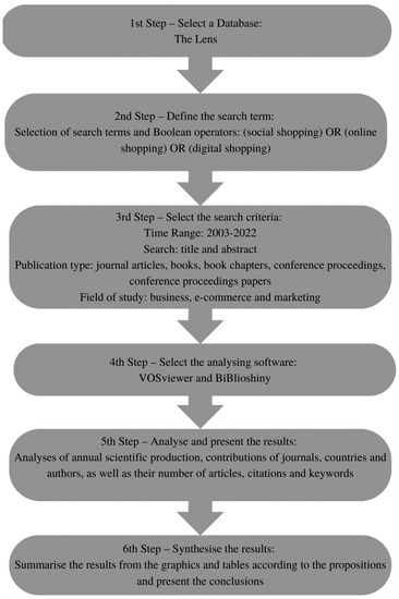 The keywords ‘social shopping’, ‘online shopping’ and ‘digital shopping’ were used to perform the search from a disjunctive perspective, using the OR operator between the three words. The analysis focused on the last 20 years, that is, the search was restricted to publications between 2003 and 2022. The perspective of technical–scientific quality existing in the type of publication, journal articles, books, book chapters, conference proceedings and conference proceedings was considered. Also, to obtain more specific results within the scope of this study, ‘business’, ‘e-commerce’ and ‘marketing’ were selected as fields of study. A total of 28,520 publications were obtained. In a previous analysis of the results, it was understood that some publications did not focus on the research field. Thus, the search was refined using the fields, title, abstract, keywords and field of study and 15,322 publications were obtained. Finally, for the analysis and visualization of the data obtained, the VOSviewer software version 1.6.19 and the Biblioshiny software version 4 were used. The second software was used to be able to generate graphs that allow for a better graphical representation compared to VOSViewer.