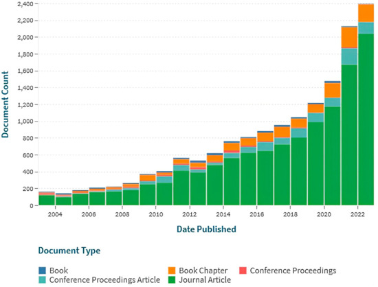 This study includes 15,322 documents over a period time of 20 years, i.e., between 2003 and 2022. Figure 3 shows the volume of annual scientific production resulting from the research carried out considering the elements presented in steps 2 and 3 in Figure 2. Thus, it is possible to verify that the annual scientific production on the topic of social shopping shows growth. Considering that, in 2003, 159 documents were published and, in 2022, 2395 documents were published, the growth was 1406%.