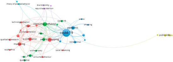 Figure 7 presents the co-occurrence of authors’ keywords, which also reflects the impact of COVID-19 on social shopping. A minimum of 4 of occurrences of a keyword were considered and, thus, a total of 39 keywords distributed over 7 clusters were obtained. The largest cluster is the red cluster, with 13 words where the keyword ‘online shopping’ stands out, with 21 occurrences. It is followed by the green and dark blue clusters, both with nine words. In the green cluster, the keyword ‘consumer behavior’ stands out, with 21 occurrences. In the third cluster, with the dark blue color, the keyword ‘COVID-19’ stands out, with 82 occurrences, which is a word in all clusters with the highest number of occurrences. The furthest clusters are the fourth yellow cluster, where the keyword ‘public policy’ stands out; the fifth purple cluster, where the word ‘repurchase intention’ stands out with four occurrences and, finally, the sixth cluster, light blue, consisting of only two words, both with two occurrences.
