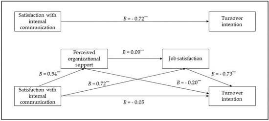 Satisfaction with internal communication’s influence on turnover intention through perceived organizational support and job satisfaction. Workers’ type of employment contract as covariate; number = 370; B = non-standardized regression coefficient; *** p < 0.001.