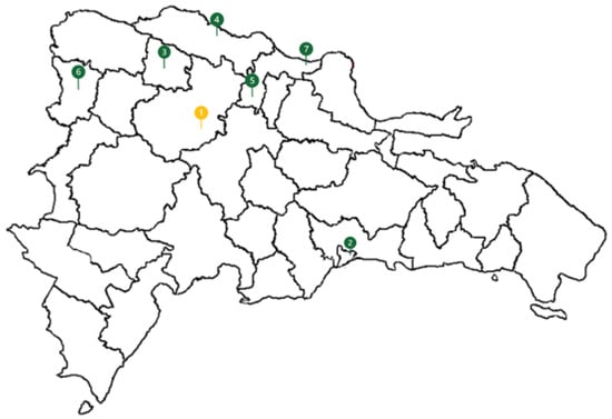 Figure 2. Areas where the UTESA university is located. Source: Prepared by the authors. Notes: 1. Santiago de los Caballeros; 2. Santiago de los Caballeros; 3. Mao; 4. Puerto Plata; 5. Moca; 6. Dajabón; 7. Gaspar Hernández.