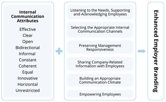 Based on the systematic literature review and the results obtained, a new model for Internal Communication-Related Recommendations to Achieve an Enhanced Employer Brand is proposed, as seen in Figure 2. This combines the attributes of internal communication (Table 1) with the recommendations identified (Table 2) to improve employer branding in an organisational context.