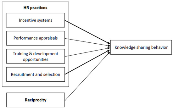 One of the objectives of this paper is to examine the empirical effects of certain Human Resource Management (HRM) practices and reciprocity as antecedents of knowledge-sharing (KS) behavior. In an organization, human resource knowledge quality plays a key role in the effective performance of the organization by communicating their knowledge with management and co-workers to perform their tasks in a better way. This is possible only when useful and relevant quality knowledge is successfully shared. Despite various studies on this topic, there is little research on KS and HRM practices in developing countries like Pakistan. A survey-based approach is used for data collection from different employees in the banking sector of Pakistan. The hypotheses are formulated based on the four HRM practices and reciprocity. The dataset is critically investigated using structural equation modeling (SEM). The results of this study suggest that reciprocity, recruitment and selection, and performance appraisals have a significant relationship with KS behaviour. Furthermore, KS is independent of employees’ training and development along with incentive systems in organizations. The contribution of this paper is how certain HR practices and employees’ perceptions about reciprocity influence employees’ knowledge sharing in an organization. This paper assists employers, employees, policymakers, and scholars to understand the factors that can promote knowledge sharing. This study also highlights the significant role of Human Resource Practices (HRP).