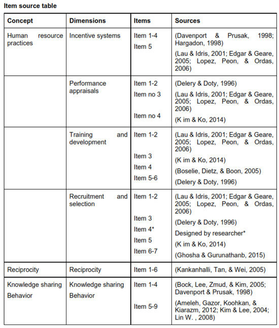 The research design is cross-sectional, where a questionnaire survey-based research method was used (see Figure 2 for the item source). The population used was the banking sector in Pakistan. The samples of this study were banks located in Lahore. Convenient sampling was used for sample selection (i.e., banks’ employees). The main reason behind choosing the Pakistani banking sector was due to growth; almost every bank has branches all over the country, especially in rural areas. Knowledge-sharing behaviour is also important in this sector to sustain performance in the competitive market (Gillani et al. 2018). Another reason for choosing the banking sector is that there is tremendous competition among banks in different area to attract customers and this leads to positive growth in technological efficiency in Pakistani banks (Shair et al. 2021).