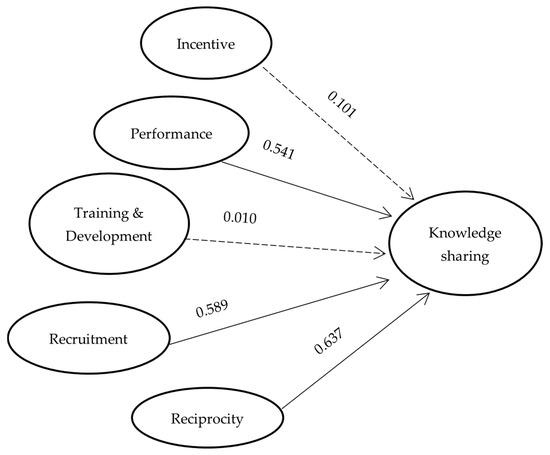 For the path validity of this model, the statistical implications of all essential parameter values are observed. As shown in Figure 3, the outcomes suggest that the relationship between performance appraisal and KS behaviour (H2) (p-value < 0.05), recruitment and selection and KS behaviour (H4) (p-value < 0.05), reciprocity and KS behaviour (H5) (p-value < 0.01) are significant and supported by the results of current studies (see Table 3 for details). On the other hand, there is no significant relationship between incentive systems and KS behaviour (H1) (p-value > 0.05), training and development and KS behaviour (H3) (p-value > 0.05), not supported by the results of current research.
