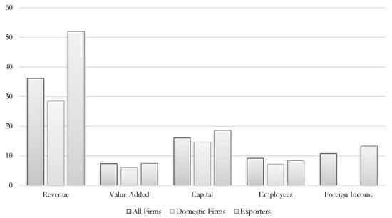 Figure 1 illustrates the differences in means for key firm-level characteristics. The exporter premia over domestic firms (those that neither export nor have any pre-tax foreign income) across these figures are largely consistent with expectations from the existing literature. Exporters are larger in terms of revenue, capital, and employees and have a higher value added. The sample of all firms includes those with foreign affiliates; consequently, the difference between exporters and the average firm is less marked.
