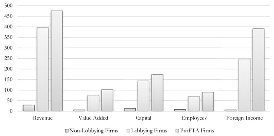 Lobbying and non-lobbying firms, 2010–2011. Note: Apart from employees, all values are in 2010 USD. Revenue, value added, and capital are presented in hundreds of millions, while foreign income is presented in tens of millions.