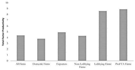 A comparison based on TFP is presented in Figure 3. Domestic firms have the lowest mean TFP, while exporters exhibit a significant TFP premium over domestic producers. The difference between lobbying and non-lobbying firms is more remarkable, however, with a lobbying TFP premium of nearly 100 percent (8.6 to 4.3). As the firm-level variations in Figure 2 suggest, firms publicly lobbying in favor of the FTAs are both the largest and most productive group. Descriptive statistics are also presented in Table A3 in Appendix A.