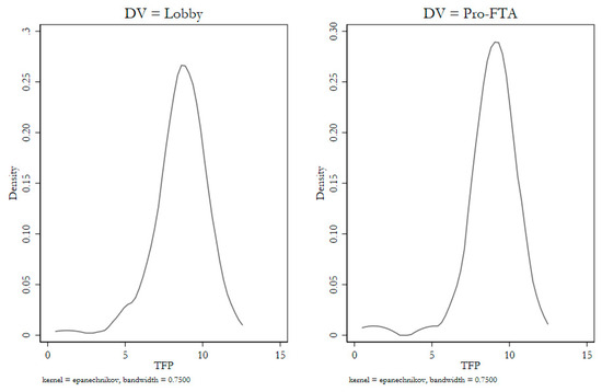 Kernel density of TFP for lobbying and pro-FTA firms.