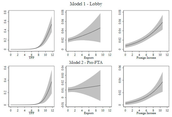 The models in Table 2 paint a consistent picture of the effects of TFP on the lobby and pro-FTA. In Models 1 and 2, a unit increase in TFP is associated with a 1.5% and 0.8% increase in the likelihood of lobbying or lobbying with a public pro-FTA stance, respectively. Export sales are positively linked to lobby but not pro-FTA, while foreign income is positively associated with both behaviors. The scobit models with foreign income included are quite similar to a standard logit, as demonstrated by α’s of 0.579 and 0.497, respectively; this is in stark contrast with those relying solely on TFP and export indicators (see Appendix A for results). Models 3 and 4 present conditional logit results with industry effects. While export sales are insignificant in both instances, the AMEs for TFP and foreign income are larger relative to those in Models 1 and 2; this is likely due to the fact that industries without variation in the dependent variables are dropped from the sample. Model 5 presents multinomial logit results, with lobby and pro-FTA presented as alternate choices for firms to take in the political market, in addition to not lobbying. As in the preceding models, TFP is positively linked to both lobby and pro-FTA, as is foreign income.