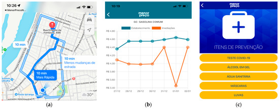 Fastest route (a); gasoline price history (b); and shortcut to COVID-19 prevention items (c). Source: Direct in-app search.