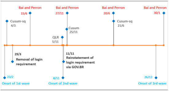 Timeline with exogenous event dates (below) and probable structural break dates according to the different tests (above). Source: Search results. Prepared by the authors. Note: Below are the start dates for the COVID-19 waves and changes to the way you log in to the application. Above dates indicate structural breaks using different methods.