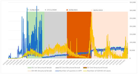 In summary, multiple breaks were initially estimated using the Bai and Perron method. Subsequently, a regression analysis was performed between queries made to the application and the number of new daily COVID-19 cases. Finally, dummy variables representing the structural breaks found in the regression analysis were included. This was performed to verify the possible associations between the dates. The following models were estimated: