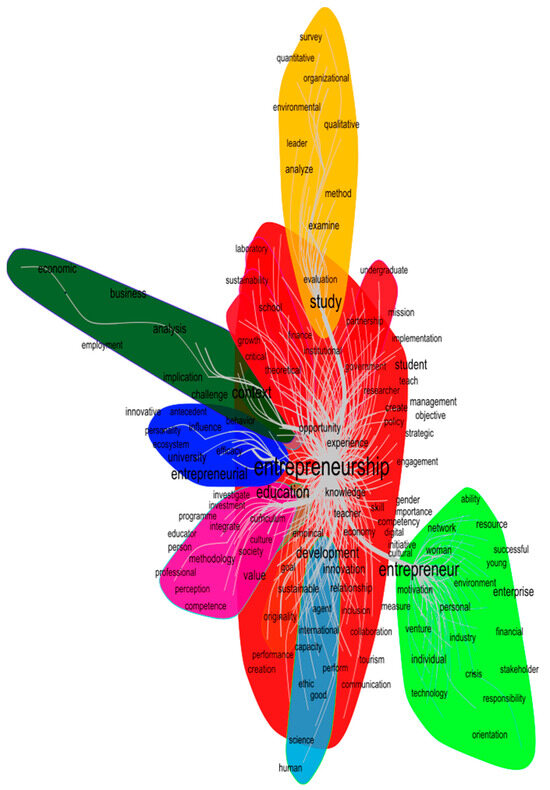 Entrepreneurial university: The cluster represented by the dark blue bubble highlights the adjective entrepreneurial with the noun university, which confirms the large number of studies at the higher education level. Social enterprises have become a suitable methodological instrument in management education (Awaysheh and Bonfiglio 2017). The concept of entrepreneurial university is largely studied in the literature (Forliano et al. 2021) and is identified to be a great trend. A new role of universities is confirmed as entrepreneurial organizations that goes beyond teaching and research plays an active influence in the socioeconomic development of the communities where they operate (García-Hurtado et al. 2022).