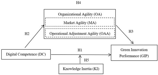 Organizational agility (OA) mediates the relationship between digital competence (DC) and firms’ green innovation performance (GIP);
