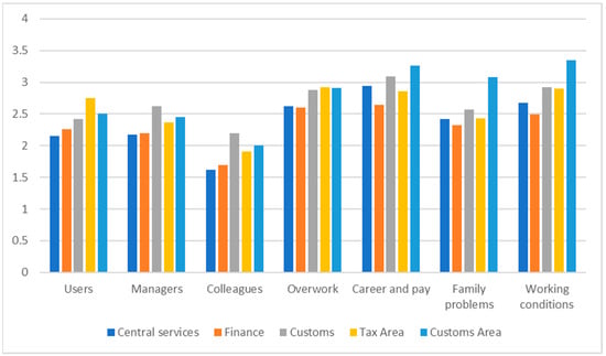 The results show that the participants in this study reported levels of stress, with all the dimensions having an average significantly higher than the central point of this scale (2), except for the “stress caused by colleagues” dimension (Table 2). It was the employees working in the customs officers who showed the highest levels of stress in terms of stress about career and pay, family problems, and working conditions (Figure 2). The employees working in finance had higher levels of stress caused by users and overwork (Figure 2). Concerning the stress caused by colleagues and managers, the employees working in customs reported the highest levels (Figure 2).
